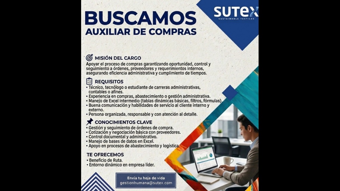 Importante empresa del sector textil se encuentra en búsqueda de un(a) Auxiliar de Compras proactivo(a), organizado(a) y con orientación al servicio, que apoye la gestión eficiente del proceso de abastecimiento y compras de la compañía.